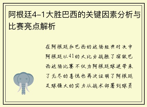 阿根廷队在2022年世界杯的胜利,不仅是球队历史上的第三次世界冠军,更是梅西个人职业生涯的巅峰之作。这场胜利背后,是无数年辛勤的奋斗,是梅西个人梦想的实现,也是团队协作的最佳体现。梅西从小的艰苦成长、与团队的默契配合、球场上的坚韧精神,以及阿根廷足球文化的深厚底蕴,都为这次胜利奠定了基础。本文将从四...